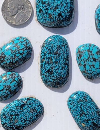 Spiderweb Gibbsite and Imitation turquoise composite made from barium oxide and manganese pigments. Is this real Turquoise? No. If it was, it would be worth a few $1000.00 ++ a Lb. Does one care? It is nice stuff. The small webbing is mostly the imitation. The larger is mostly gibbsite with the black and calcopyrite. More info on the Imitation: Rather it is composed of barium oxide, which is used as a porcelain glaze and pigment, heating barium oxide in the presence of manganese creates a turquoise colored imitation pigment. The matrix is composed of iron oxide to give it the black webbing pattern and glistened with additional chalcopyrite to add additional color. Surprisingly, it also contains a considerable amount of lead, which is safe if handled properly and cut or polished with adequate ventilation. See other sellers on the net to see what they say/charge. In the picture is 9.6Oz's or $96.00 See examples of some cabs S & H is $6.36