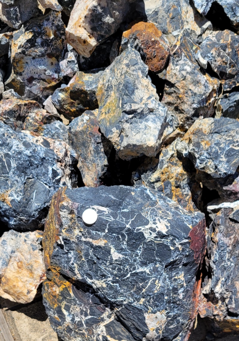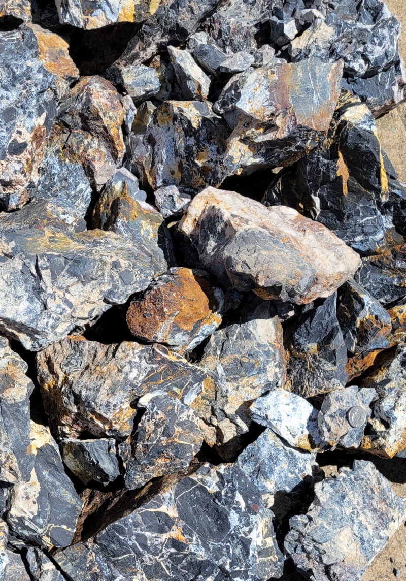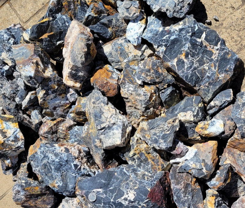 White Lighting or Iron Buffalo stone $5.00 Oz. As you might know Rough White Buffalo is found in a number of locations around Tonopah NV. Both in Esmeralda and Mineral County. Some is more white than black. I now want to call this material White Lightning as the Otteson's call it White Buffalo and no Bison about it. The material I have is more black and was found in Esmeralda county. This material did not come from an Otteson claim. I did not pick up small pieces as the material is in seam-large clusters. This material is opalized calcite and chert. White Buffalo/White Lighting/Iron Buffalo is calcite, Dolomite and aragonite and are just different crystalline structure of calcite. Some of the white is straight opalized calcite, some is dolomite (opalized) and some is aragonite. All are calcite. (White) When slabbing, I noticed the yellow does go through and is not an outside iron stain. I went to E bay to see the material they sell at a high price and the small pieces looked tumbled. Mine is rough rock. Most of my chunks are different sizes and many over 1 LB. Let me know before you order a general range (Example: 10 Oz's to 20 Oz's.) on what you might want and I will get back to you with a total price to include S & H. Only $5.00 Oz. Over 1 lb $4.00 Oz.