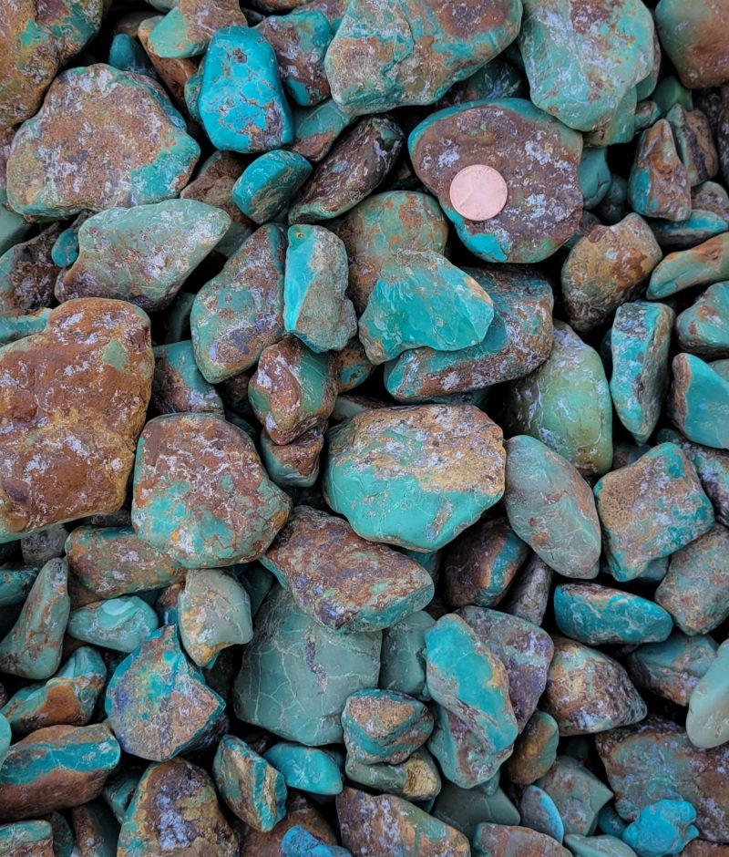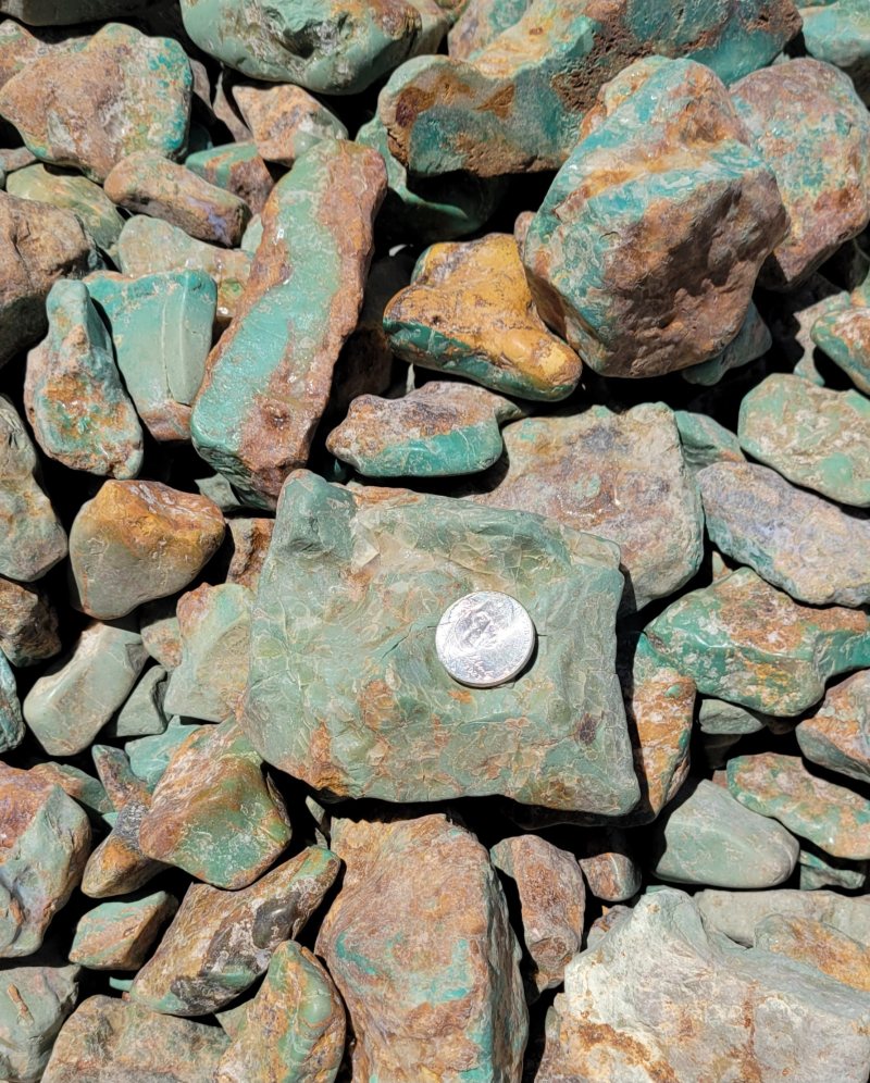 Old Green stabilized Kingman turquoise. We were selling this as Chinese green turquoise, as that was what we were told by a note when we bought it. I decided to have it XRF tested. In the nut shell, "The green specimen is heavily stabilized Kingman, containing almost half epoxy/resin and it is likely from the Hardy Pit." I just did a Google search for Green kingman turquoise and on the top was a color match. My price is not changing at $18.00 and Oz. or $16.00 an Oz. over 16 Oz's.
