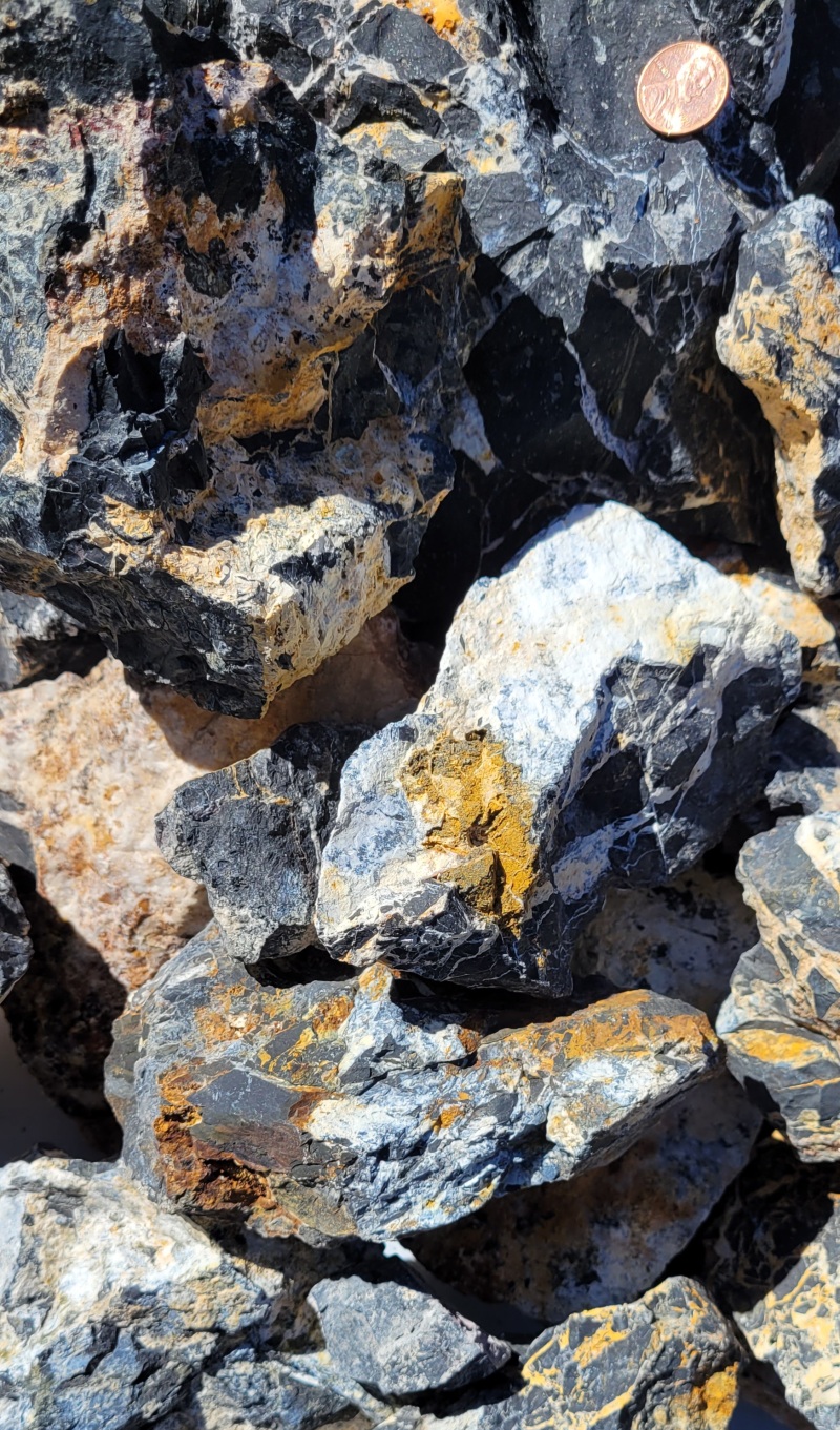 White Lighting or Iron Buffalo stone $5.00 Oz. As you might know Rough White Buffalo is found in a number of locations around Tonopah NV. Both in Esmeralda and Mineral County. Some is more white than black. I now want to call this material White Lightning as the Otteson's call it White Buffalo and no Bison about it. The material I have is more black and was found in Esmeralda county. This material did not come from an Otteson claim. I did not pick up small pieces as the material is in seam-large clusters. This material is opalized calcite and chert. White Buffalo/White Lighting/Iron Buffalo is calcite, Dolomite and aragonite and are just different crystalline structure of calcite. Some of the white is straight opalized calcite, some is dolomite (opalized) and some is aragonite. All are calcite. (White) When slabbing, I noticed the yellow does go through and is not an outside iron stain. I went to E bay to see the material they sell at a high price and the small pieces looked tumbled. Mine is rough rock. Most of my chunks are different sizes and many over 1 LB. Let me know before you order a general range (Example: 10 Oz's to 20 Oz's.) on what you might want and I will get back to you with a total price to include S & H. Only $5.00 Oz. Over 1 lb $4.00 Oz.